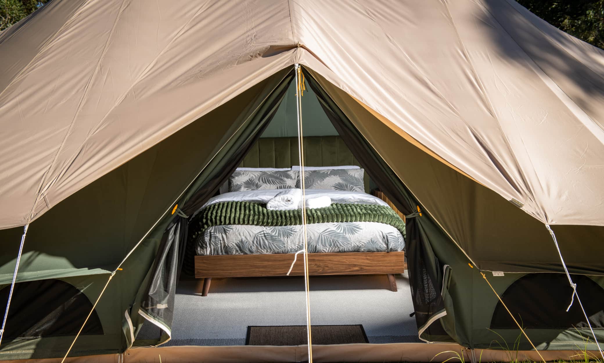 Drive straight on past the Henry White Oval campground and turn left onto the Wilderstay Glamping exclusive site. Parking is available beside the tent.
